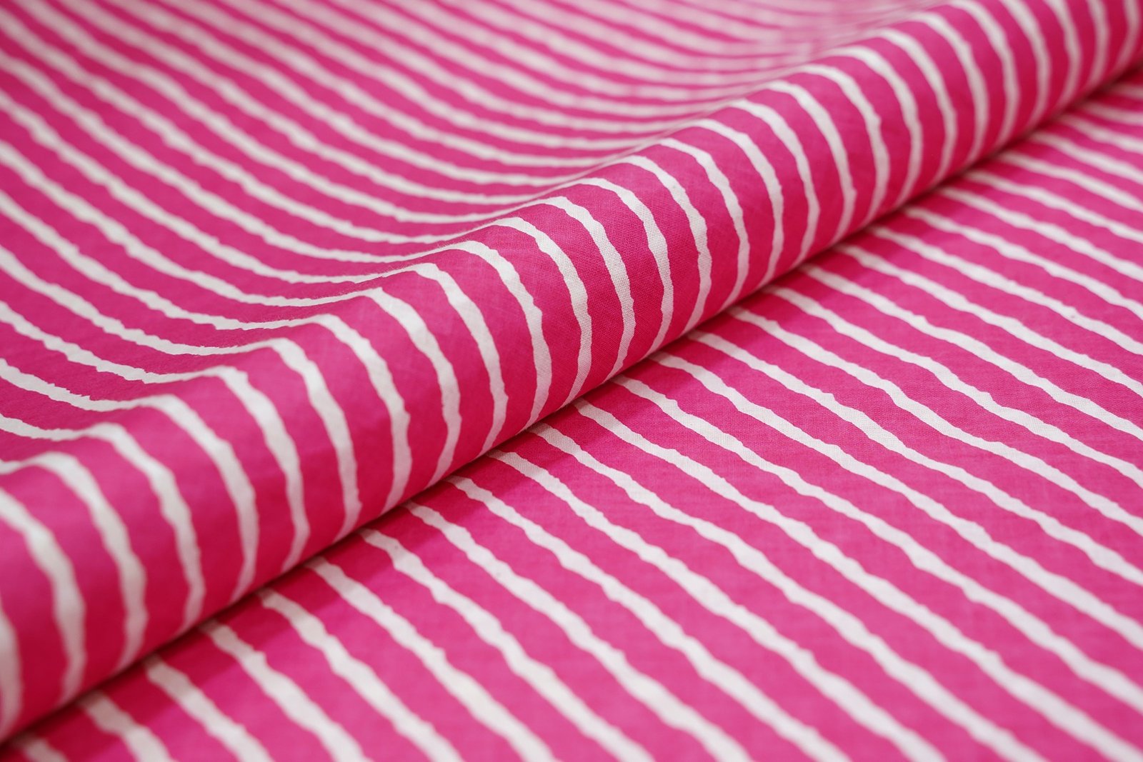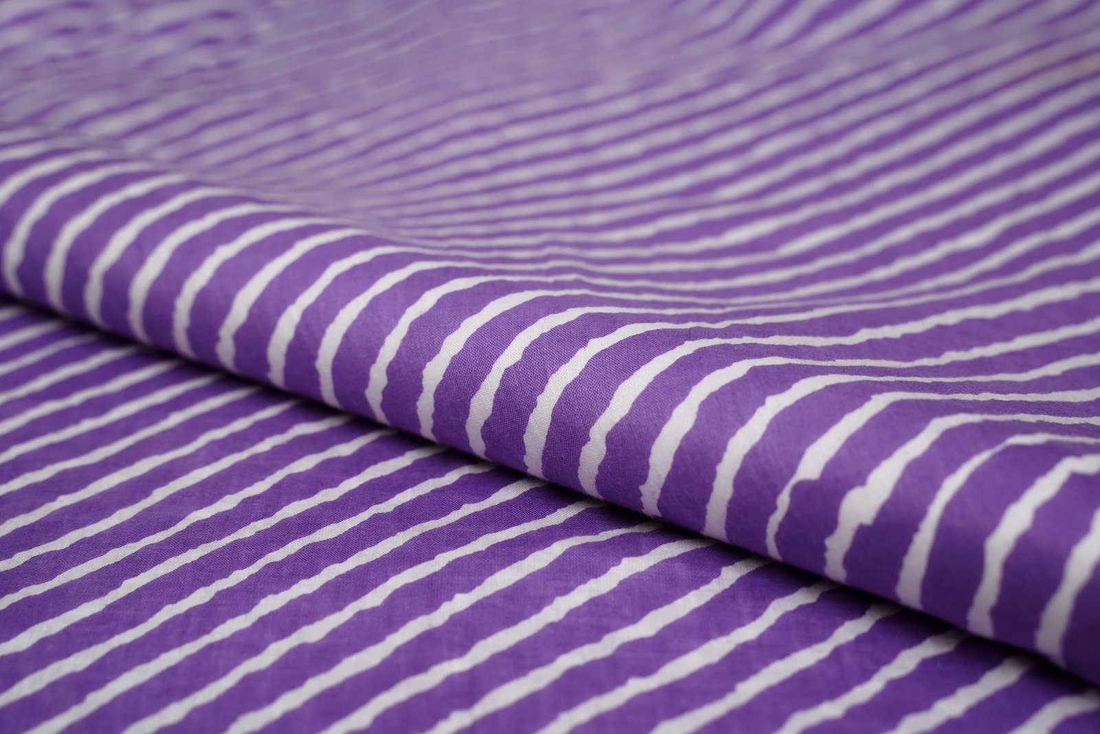 CATMINT PURPLE COLOR COTTON SCREEN PRINT WITH WHITE ABSTRACT LEHERIYA PATTERN 112 CMS (42 INCHES) WIDTH FABRIC MATERIAL FOR VARIETY OF COSTUME STYLES SUCH AS; TOP, KOTI, JACKET, FEMALE SHIRT, SKIRT, CROP TOP, PANT, GOWN, CHOLI, ETC. |