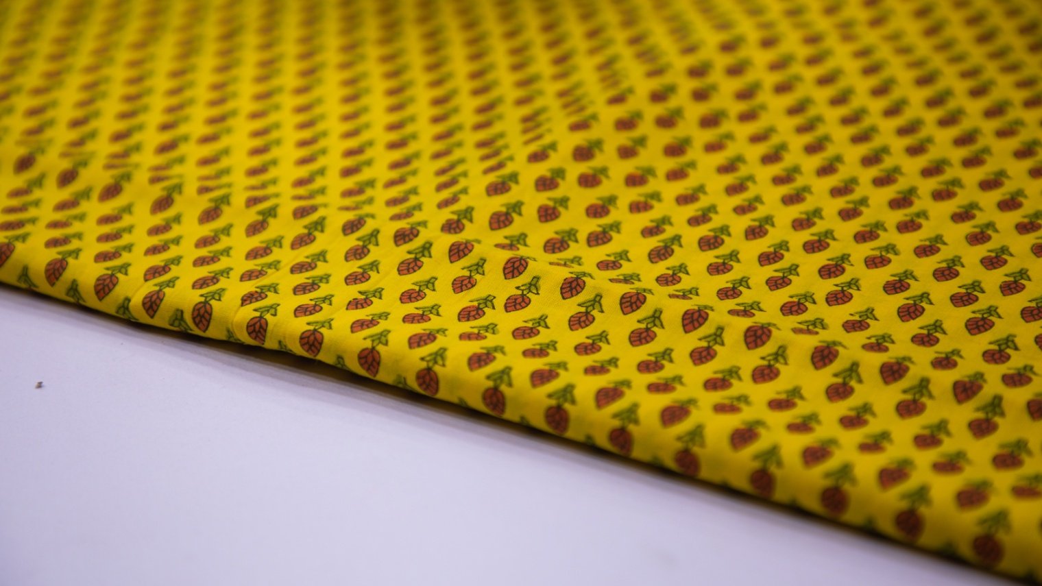 CHROME YELLOW COLOR COTTON SCREEN PRINT WITH JAIPURI RED FLOWER MOTIF 80 TO 100 GMS PER UNIT WEIGHTED FABRIC MATERIAL FOR DIFFERENT KIND OF COSTUME STYLES E.G.; BLOUSE, SAREE, DUPATTA, KURTA, KURTI, SALWAR, SUIT, TOP, PLAZZO, ETC. |