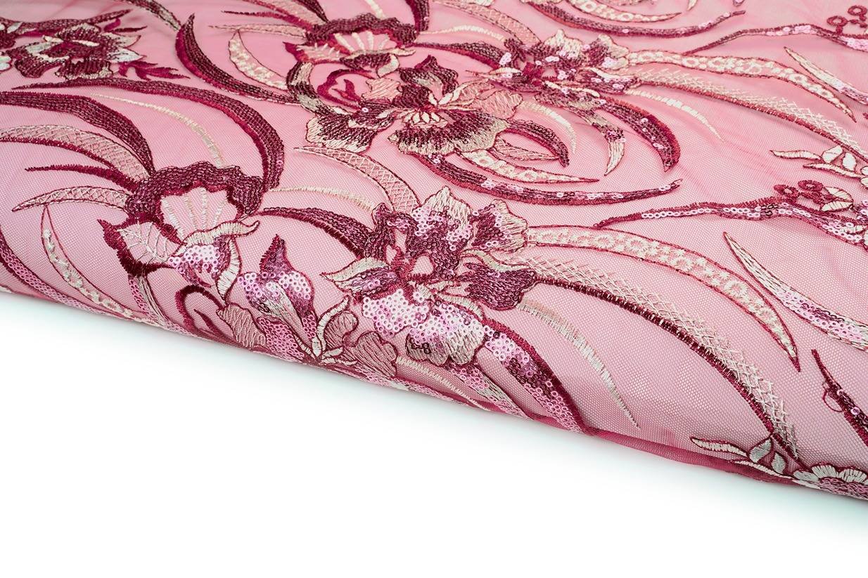 DAISY PINK COLOR NET WINE SEQUINS ALLOVER HEAVY WORK FABRIC