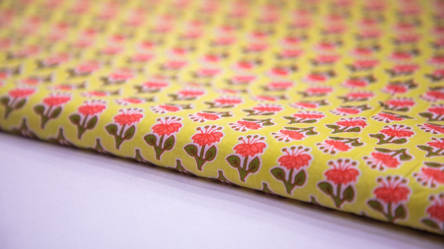 MINION YELLOW COLOR COTTON SCREEN PRINT WITH JAIPURI PINK FLORAL MOTIF 107 CMS (42 INCHES) WIDTH FABRIC MATERIAL FOR; BLOUSE, CHOLI, CROP TOP, TUNIC, KOTI, JACKET, SUIT, SALWAR, PLAZZO, KURTA, KURTI, & SO ON. |