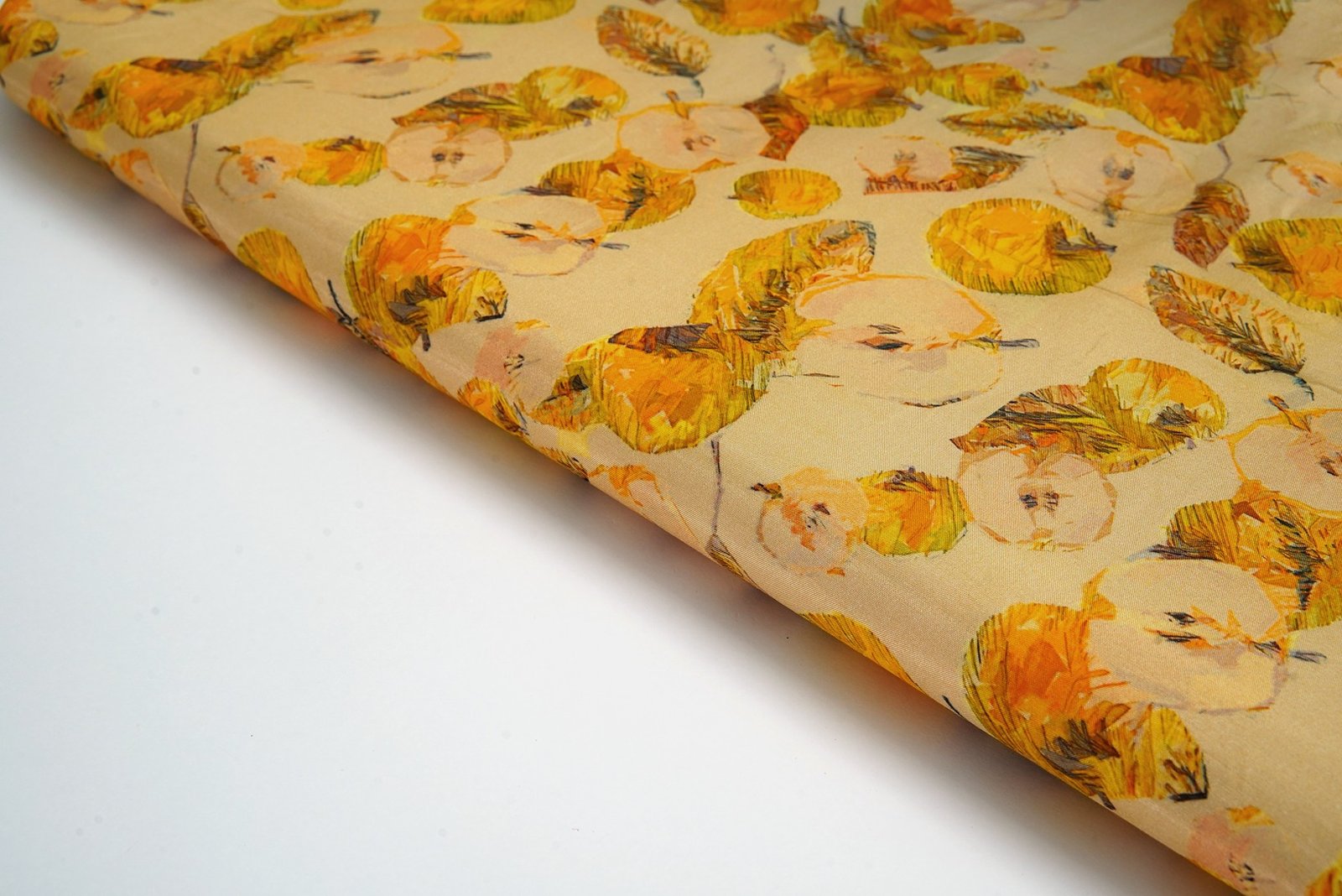 MOSAMBI YELLOW COLOR DIGITAL LEAF PATTERN MUSLIN SILK PRINT