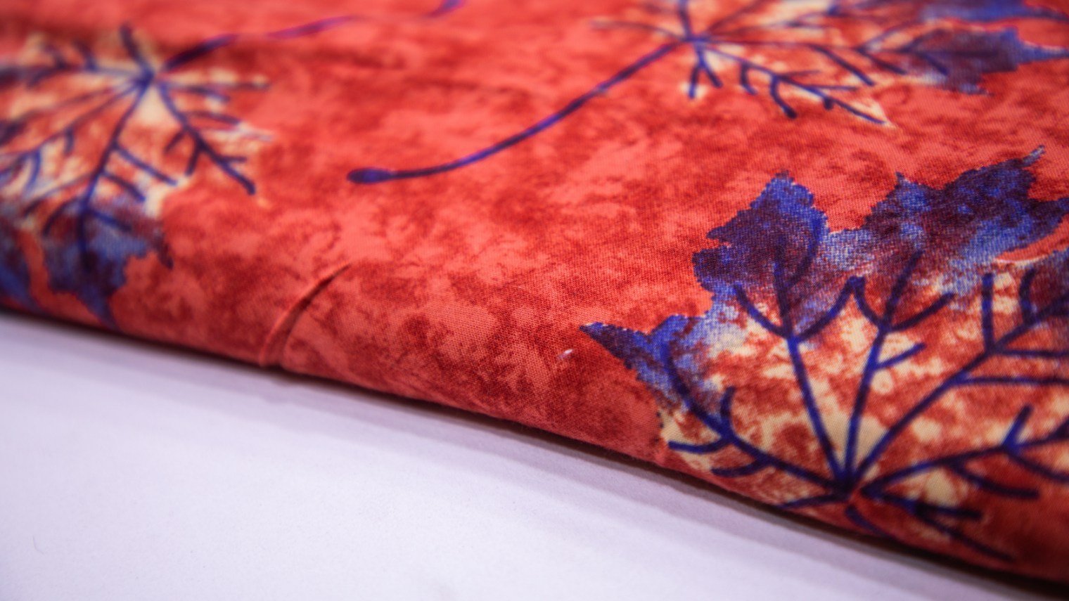 RUST ORANGE COLOR RAYON BLUE AUTUMN LEAF PATTERN SCREEN PRINT 40 TO80 GMS PER UNIT WEIGHTED FABRIC MATERIAL FOR DIFFERENT CLOTHING STYLES NAMELY; BLOUSE, KURTA, KURTI, SALWAR, JACKET, SHIRT, SKIRT, TOP, PLAZZO, & SO ON.