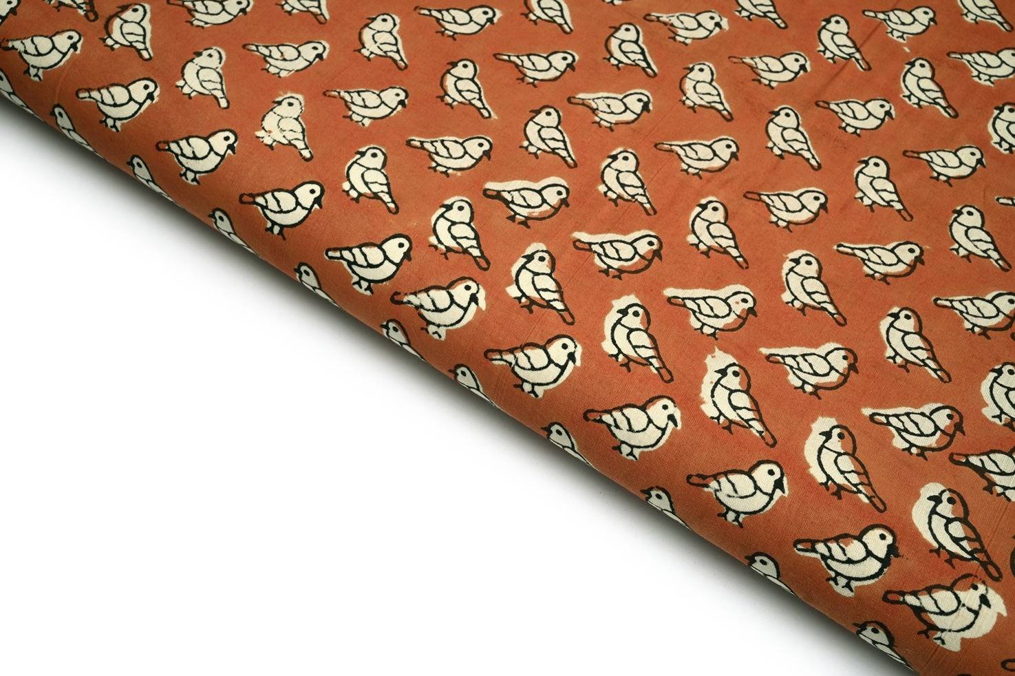 VOLCANO ORANGE COLOR COTTON GAMTHI CREAM SPARROW SHAPE HANDBLOCK MOTIVE PATTERN PRINTED FABRIC